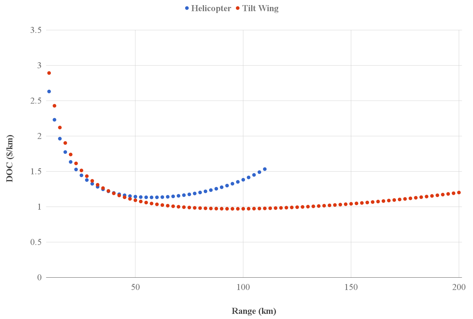 Our initial results replicate A3’s and suggest that an electric tilt-wing multirotor aircraft offers a significantly lower direct operating cost (DOC) over the more traditional electric helicopter design around the target operational range of 100 km.